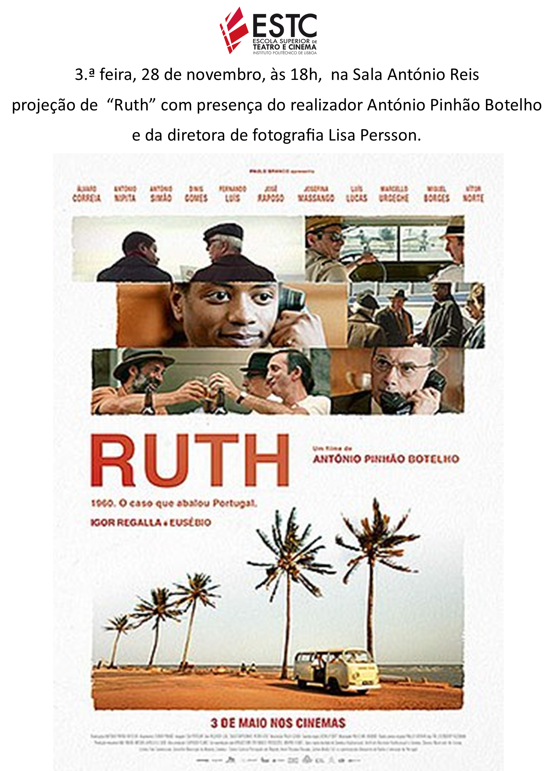 Longa metragem "RUTH" (2018) de António Botelho e com direção de fotografia de Lisa Person, produção Leopardo Filmes. Terá a presença do realizador e da diretora de fotografia, para conversa no final.
