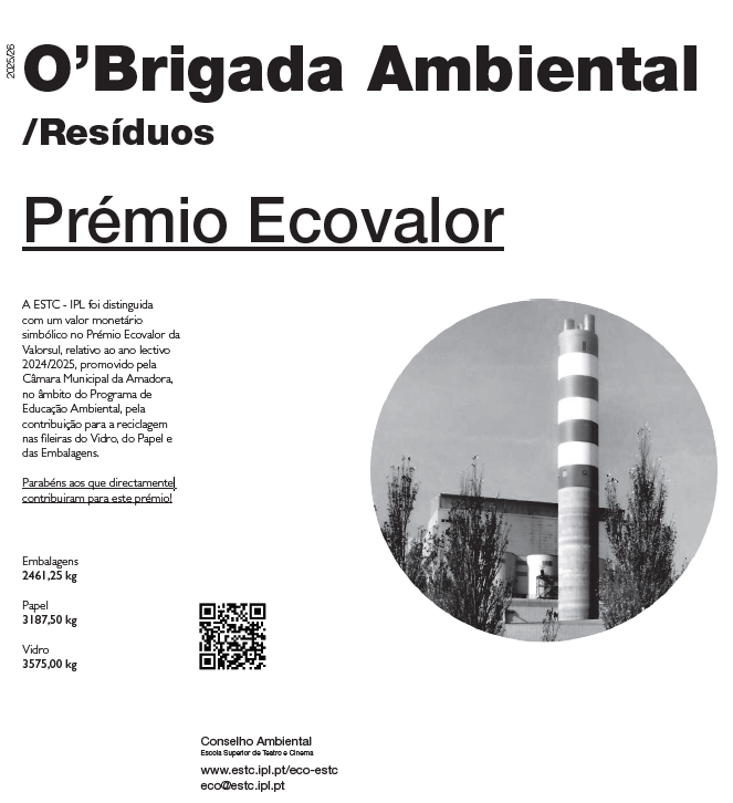 A ESTC-IPL foi distinguida com um valor monetário simbólico no Prémio Ecovalor da Valorsul, relativo ao ano lectivo 2024/2025, promovido pela Câmara Municipal da Amadora, no âmbito do Programa de Educação Ambiental, pela contribuição para a reciclagem nas fileiras do Vidro, do Papel e das Embalagens.