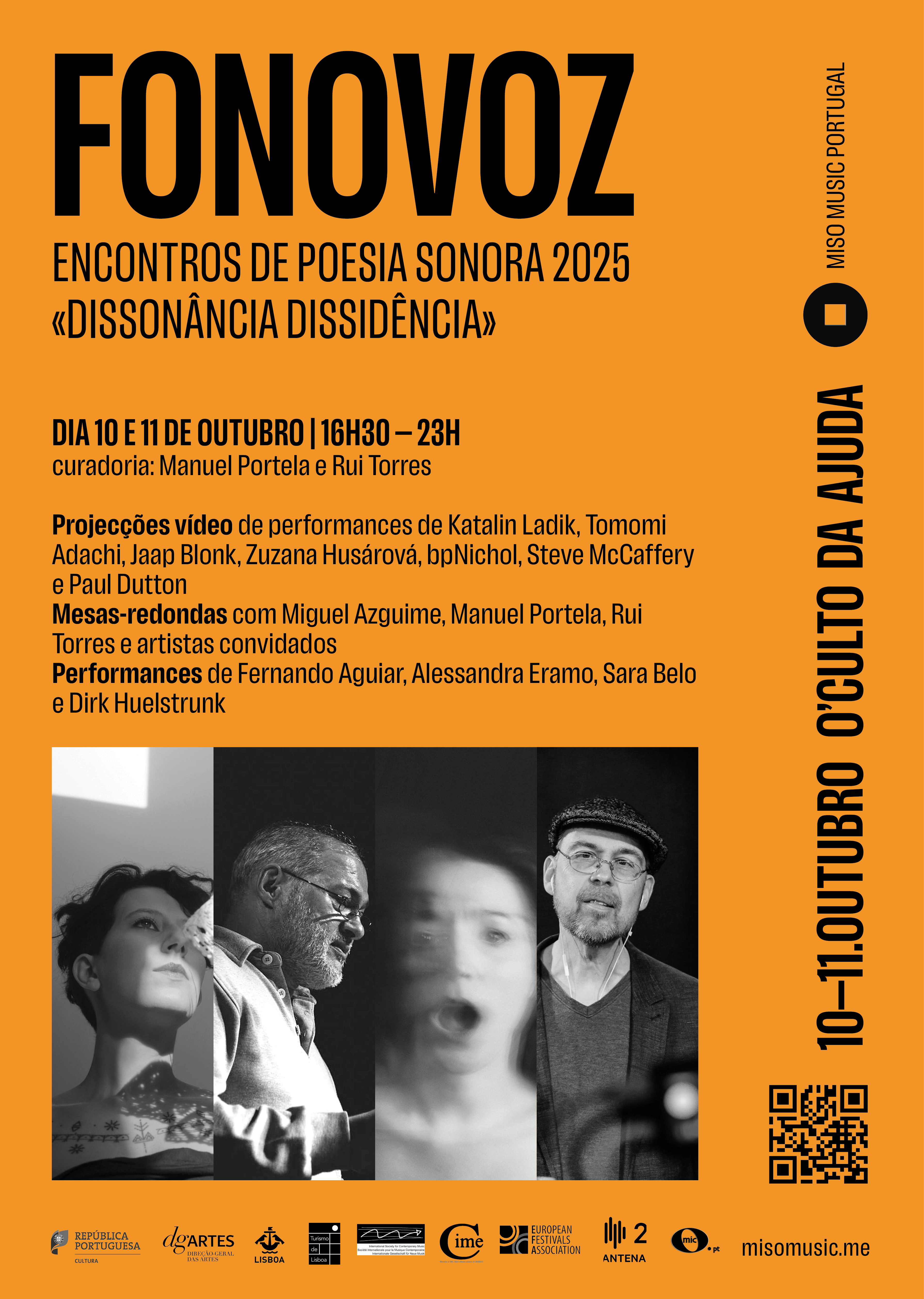 Nos dias 10 e 11 de Outubro, o O'culto da Ajuda vai receber o FONOVOZ – Encontros de poesia sonora, cuja curadoria é de Manuel Portela e Rui Torres. Vão ser dois dias dedicados à poesia sonora, sob o mote «Dissonância dissidência», com a projecção vídeo de performances de artistas emblemáticos, mesas-redondas e performances de artistas nacionais e estrangeiros, com performance da docentes do Departamento de Teatro, Sara Belo.