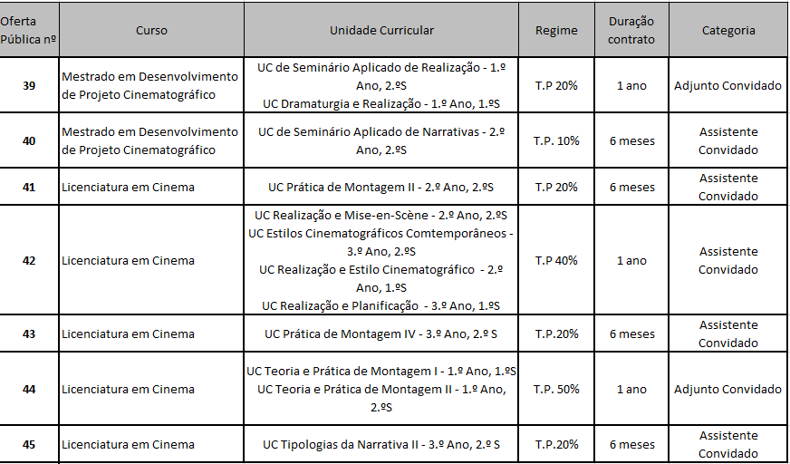 A Escola Superior de Teatro e Cinema recebe, até 23 de dezembro de 2025, candidaturas para a lecionação das unidades curriculares abaixo discriminadas, para os cursos do departamento de Cinema.