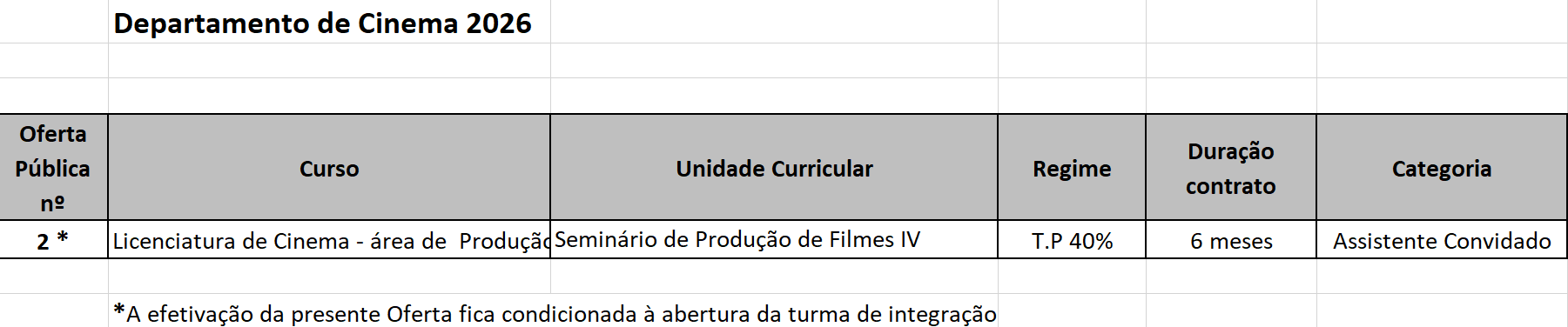 A Escola Superior de Teatro e Cinema recebe, até 20 de fevereiro de 2026, candidaturas para a lecionação das unidades curriculares abaixo discriminadas, para os cursos do Departamento de Cinema.