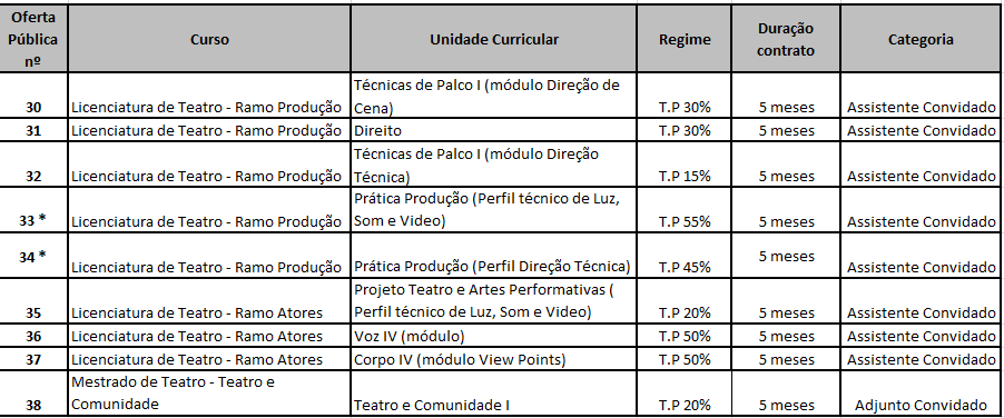A Escola Superior de Teatro e Cinema recebe, até 23 de dezembro de 2025, candidaturas para a lecionação das unidades curriculares abaixo discriminadas, para os cursos do departamento de Teatro.